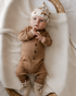 De warme cacao kleur is perfect voor het najaar en combineert prachtig met het bijpassende mutsje in dezelfde stof en beige slofjes. Ook het mutsje in Forest Animals print past er mooi bij voor een speelse twist. Een fijn en praktisch geboortepakje dat altijd goed staat.