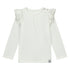 Deze ruffle longsleeve in ecru is een echte musthave voor de kleinste meisjes. Het subtiele ribstofje voelt zacht aan op de huid en de dubbele ruffles op de schouders geven het shirtje een lieve, speelse uitstraling. Dankzij de handige drukknoopjes op de schouder is aankleden eenvoudig en comfortabel voor je kleintje.